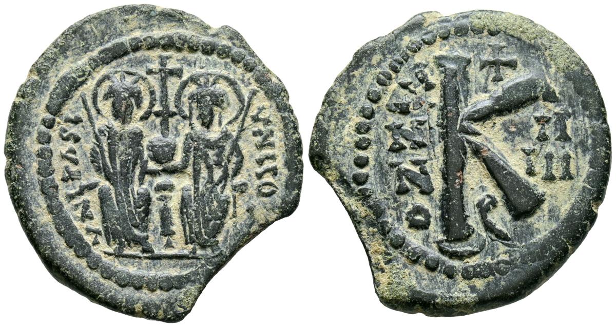 JUSTINO II y SOFIA. 1/2 Follis. (Ae. 6,91g/26mm). 569 d.C. Theoupolis. (DOC 169). Anv: Justino y Sofía sentados de frente portando cetro y globo, alrededor leyenda. Rev: K grande, entre: ANNO/II-III, encima cruz y debajo R. MBC.
