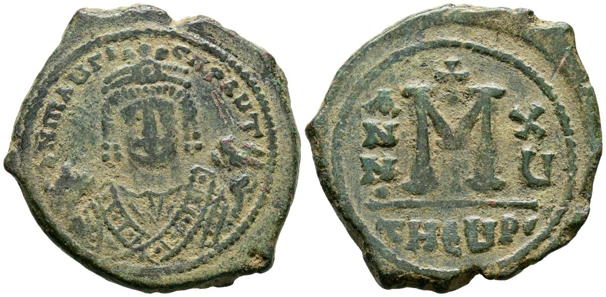 MAURICIO TIBERIO. Follis. (Ae. 11,25g/32mm). 582-602 d.C. Antioquía. (Seaby 533). Anv: Busto de Mauricio Tiberio de frente con coraza y corona, alrededor leyenda. Rev: M grande, entre: ANNO-X/U, encima cruz, debajo: THEUPS. MBC.