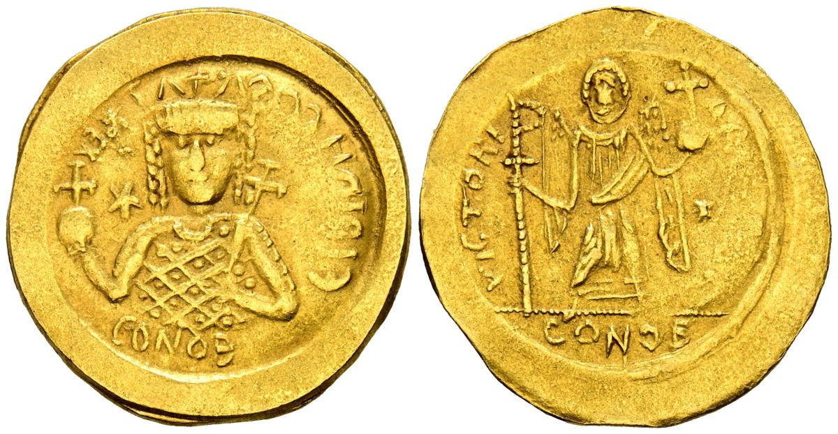 Después de Eirene (797-802 d.C.). Sólido de imitación bárbara. (Au. 4,07g/23mm). Anv: Busto coronado de frente portando globo crucífero y cruz, estrella en el campo, alrededor leyenda, debajo: CONOB. Rev: Victoria estante de frente portando globo crucífero y cruz, alrededor leyenda, debajo: CONOB. MBC. Escaso ejemplar.