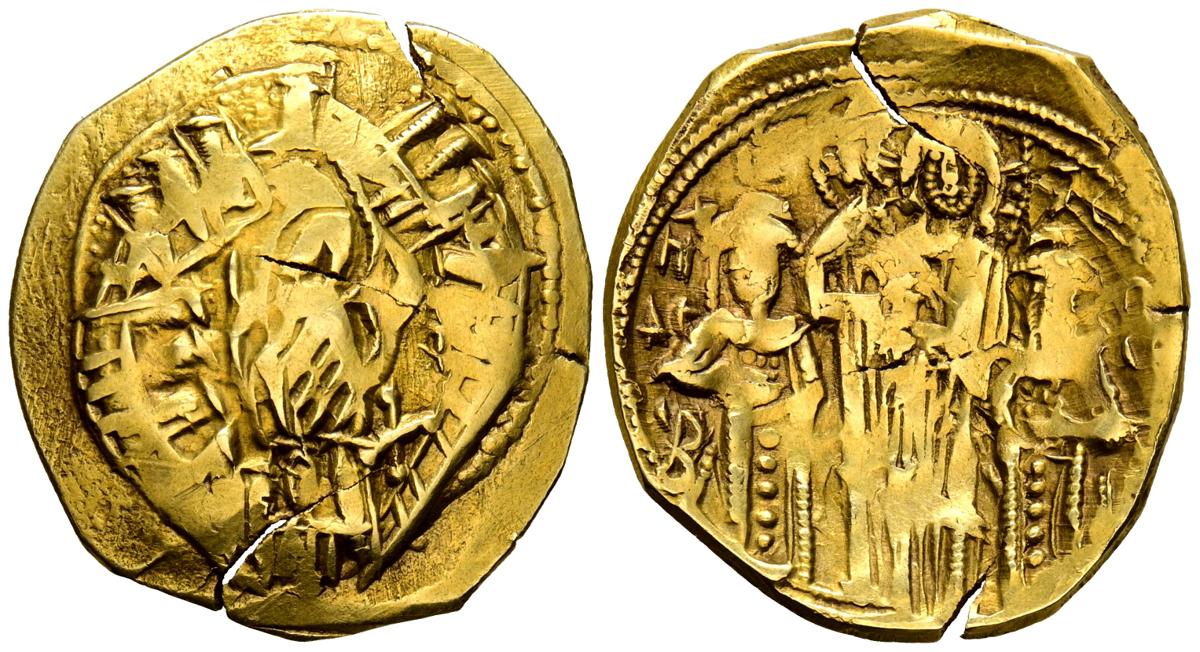 ANDRONICO II y MIGUEL IX. Histamenon. (Au. 3,64g/23mm). 1295-1320 d.C. Constantinopla. (Seaby 2396). Anv: Virgen María rezando dentro de muralla con seis torres. Rev: Cristo estante de frente coronando Andrónico II y Miguel IX arrodillados a ambos lados. MBC-.