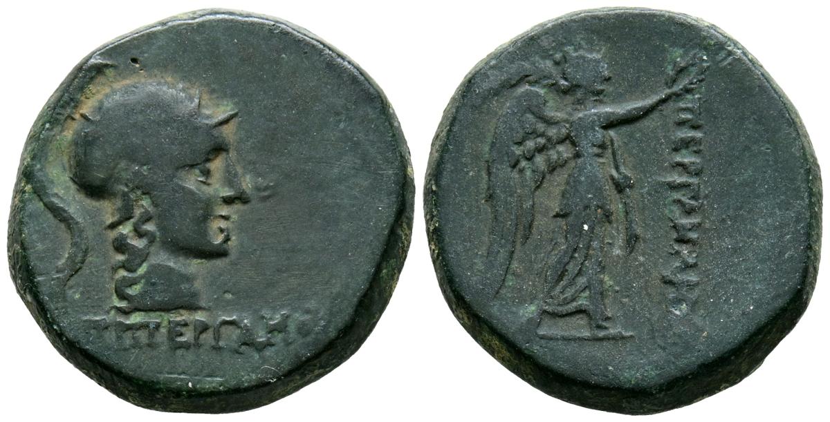 MISIA, Pérgamo. Ae20. (Ae. 7,90g(20mm). 150-100 a.C. (SNG von Aulock 1379). Anv: Cabeza de Atenas con casco a derecha, debajo leyenda griega. Rev: Nike avanzando a derecha portando corona de laurel, delante leyenda griega. MBC-.