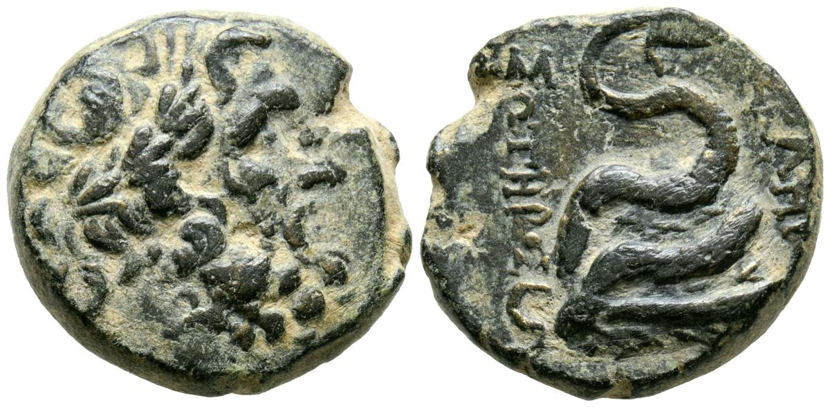 MISIA, Pérgamo. Ae20. (Ae. 8,52g/20mm). 133-27 a.C. (SNG Paris 1803-27; SNG von Aulock 1372). Anv: Cabeza laureada de Asklepios a derecha. Rev: Serpiente enrollada a Omphalos, alrededor leyenda griega. MBC.