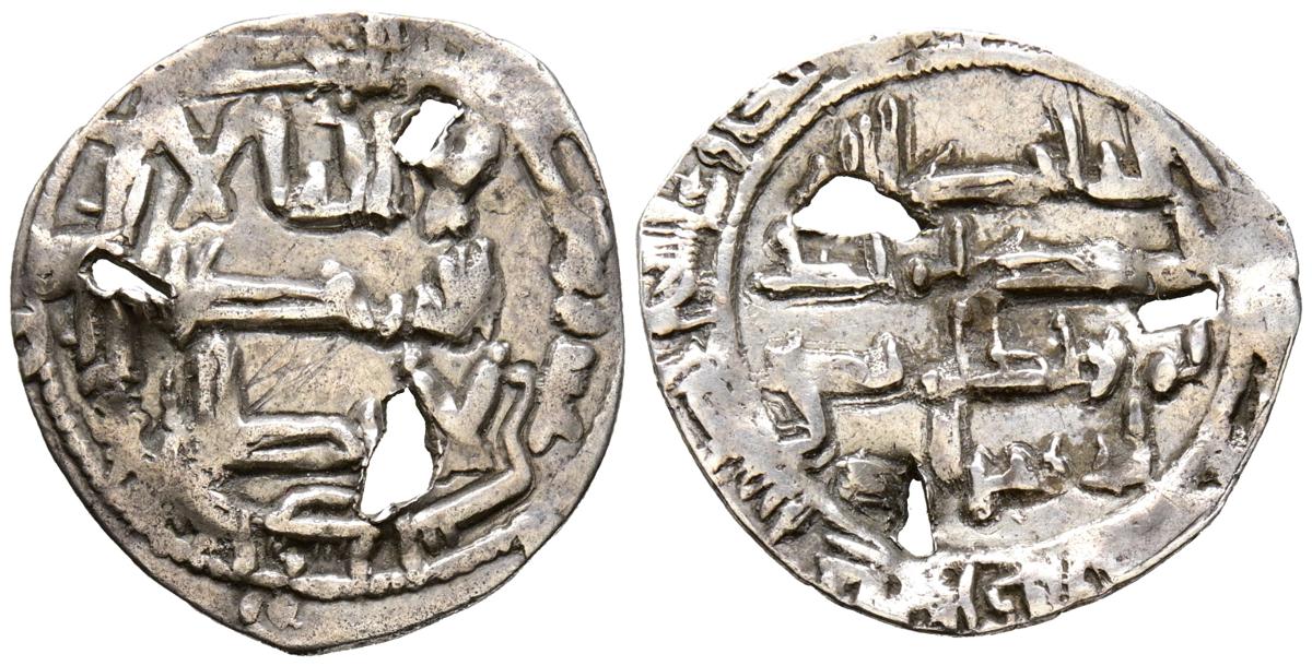 EMIRATO INDEPENDIENTE, Abd Al-Rahman II. Dirham. (Ar. 1,80g/22mm). 212H. Al-Andalus. (Vives 135). MBC. Recortada y dos perforaciones de época.