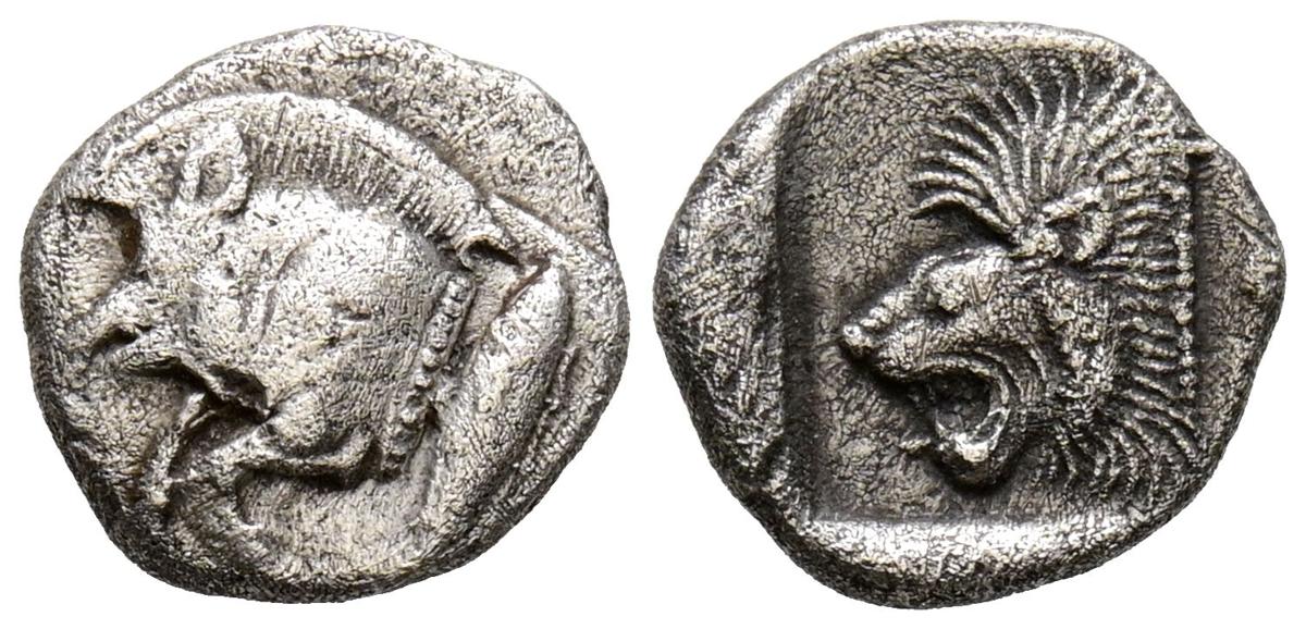 MISIA, Cícico. Obolo. (Ar. 0,84g/10mm). 450-400 a.C. (SNG France 361). Anv: Parte delantera de Jabalí a izquierda, detrás atún. Rev: Cabeza de león a izquierda dentro de cuadrado incuso. MBC.