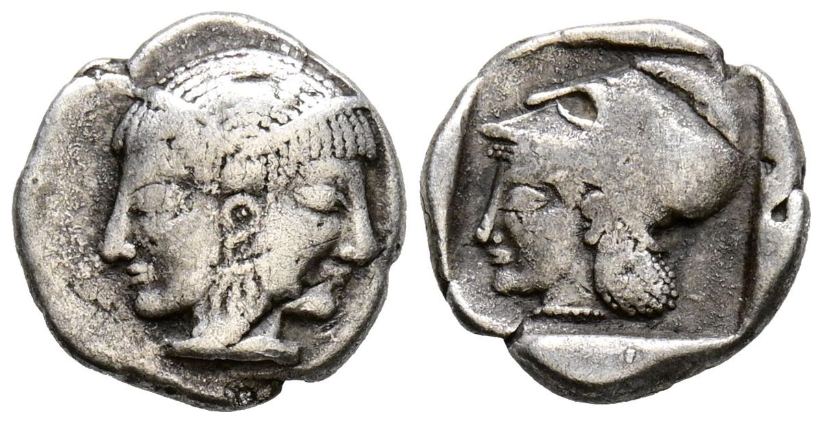 MISIA, Lapsakos. Trihemióbolo. (Ar. 1,17g/11mm). 500-450 a.C. (SNG Copenhagen 184). Anv: Cabeza janiforme femenina. Rev: Cabeza de Atenea a izquierda con casco corintio dentro de cuadrado incuso. MBC-.