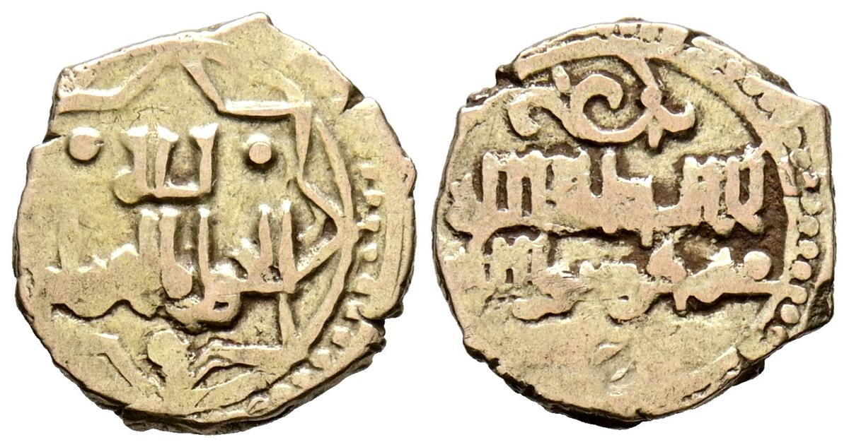 TAIFA INCIERTA, Anónima. Fracción de Dinar de electrón. (El. 0,80g/12mm). (Codera y Zaidin (1897) 1047 bis; Ibrahim, Canto (2003) Suplemento a los Reinos de Taifas, nº 169). Leyenda: De Dios el poder y la fuerza. MBC. Muy escasa.