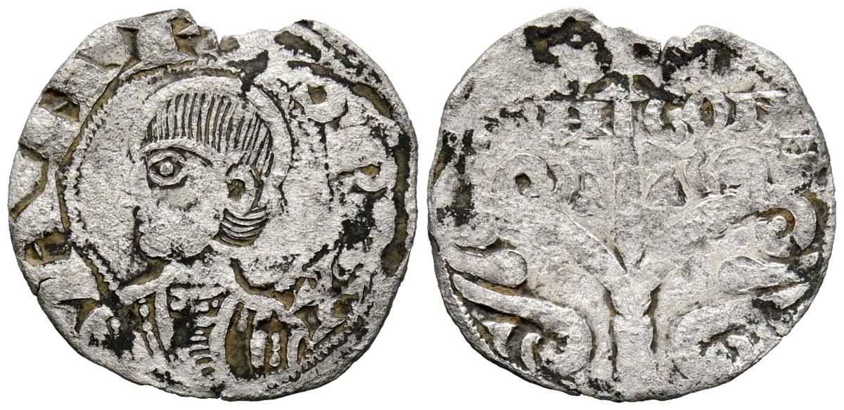 ALFONSO I (1104-1134). Dinero (Ve. 0,69g/18mm). Jaca (Huesca, Reino de Navarra y Aragón). (Cru. V.S. 217). Anv: Efigie del rey a izquierda con tres perlas en la nuca, alrededor leyenda: ANFVS REX. Rev: ARA-GON horizontalmente a los lados de árbol superado de cruz. MBC-. Cospel faltado.