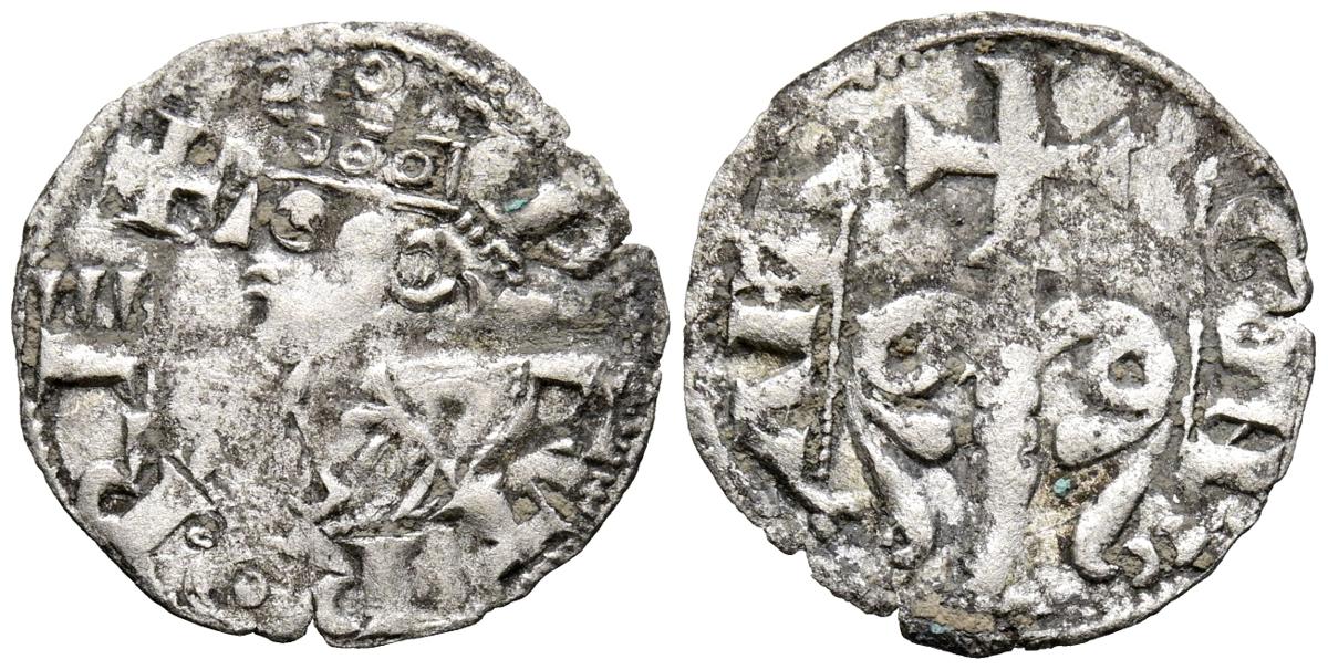 PEDRO II (1196-1213). Dinero. (Ve. 0,60g/18mm). Aragón. (Cru.V.S. 302). Anv: Busto coronado de Pedro II a izquierda, alrdedor leyenda: PETR REX. Rev: Cruz sobre árbol, alrededor leyenda: ARAGON. MBC-.