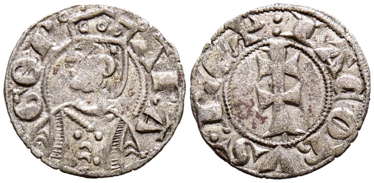 JAIME I (1213-1276). Dinero (Ve. 0,88g/17mm). Aragón. (Cru.V.S 318). Anv: Efigie coronada a izquierda, alrededor leyenda: ARAGON. Rev: Cruz patriarcal, alrededor leyenda: IACOBVS REX. MBC. Bonito ejemplar.
