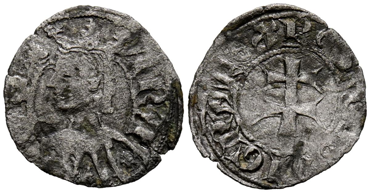 PEDRO IV (1336-1387). Dinero. (Ve. 0,73g /17mm). Aragon. (Cru VS 463). Anv: Busto coronado de Pedro IV a izquierda dentro de de grafila circular, alrededor leyenda: ARAGÓN. Rev: Cruz patriarcal dentro de grafila circular, alrededor leyenda: PETRVS DI GRA REX. MBC.