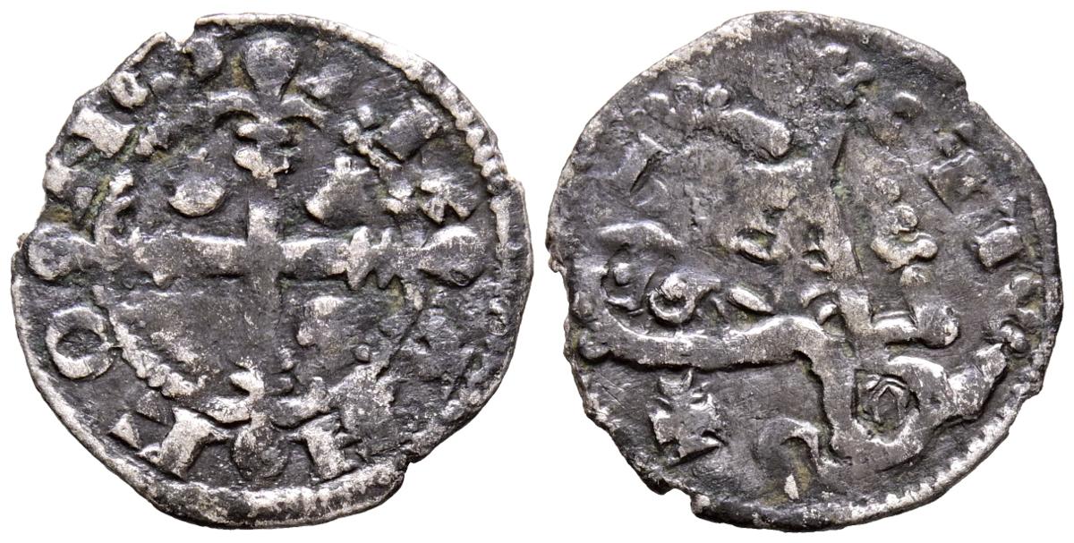 ALFONSO IX (1188-1230). Dinero. (Ve. 0,72g/17mm). ¿Ciudad Rodrigo?. (FAB-129). Anv: Cruz floreada y veneras en los cuarteles, alrededor leyenda: ANFONS REX. Rev: León a derecha encima cruz, debajo leyenda: LEO, delante R retrógada. MBC-. Escaso.