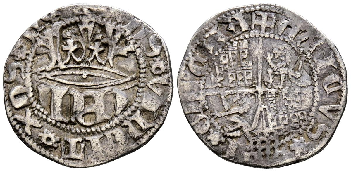 ENRIQUE IV (1399-1413). 1/2 Real (Ar. 1,43g/18mm). Segovia. (FAB-725). Anv: HEN coronada dentro de gráfila circular, en leyenda: XPS VINCIT XPS RE. Rev: Cuartelado de castillos y leones, debajo acueducto. Alrededor leyenda: ENRICVS DEI GRACIA. MBC.