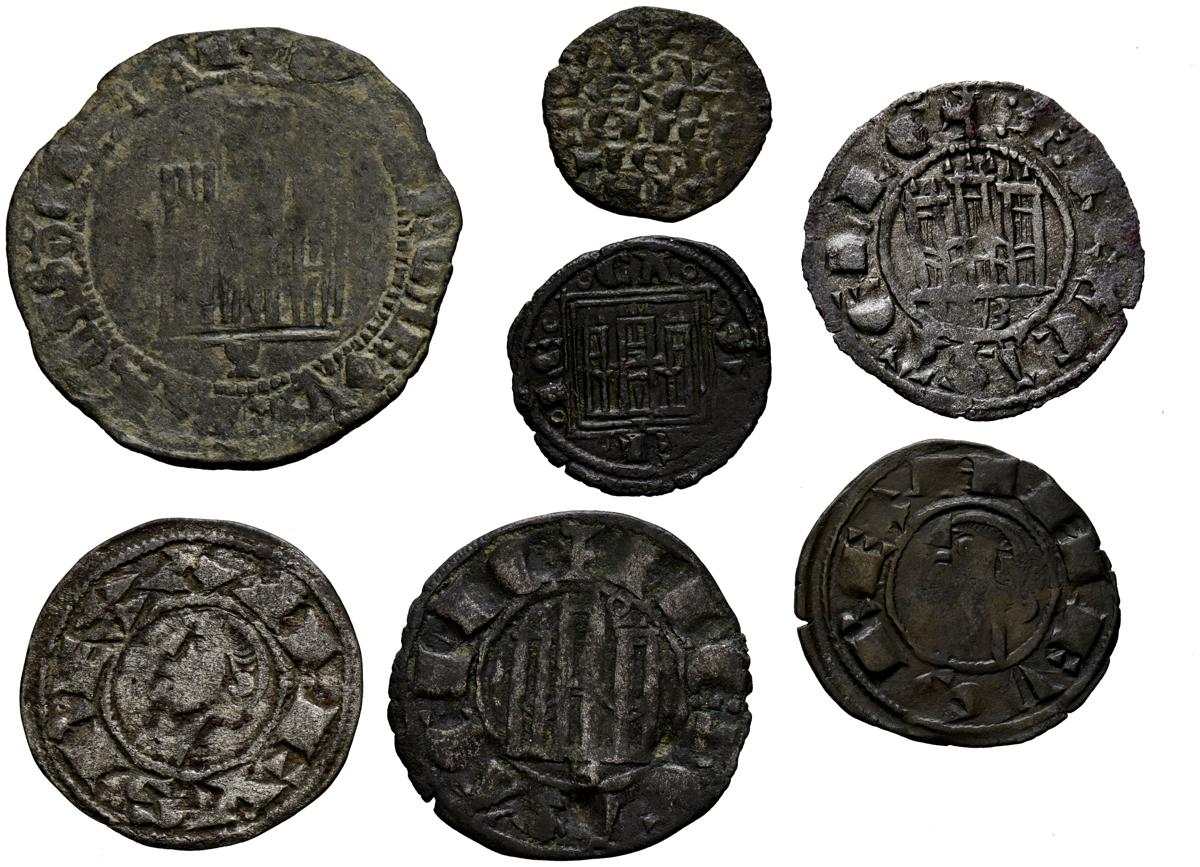 ÉPOCA MEDIEVAL. Interesante conjunto de 7 vellones acuñados bajo diferentes reinados (Alfonso X y Fernando IV principalmente) con variedad de módulos y cecas. Diferentes estados de conservación. A EXAMINAR.