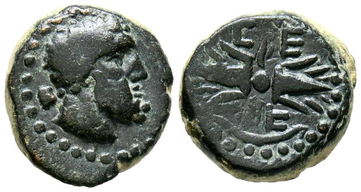 PISIDIA, Selge. Ae13. (Ae. 3,10g/13mm). Siglo II-Siglo I a.C. (SNG BnF 1979). Anv: Cabeza de Heracles barbada a derecha con mazo sobre hombro. Rev: Rayo alado. MBC.