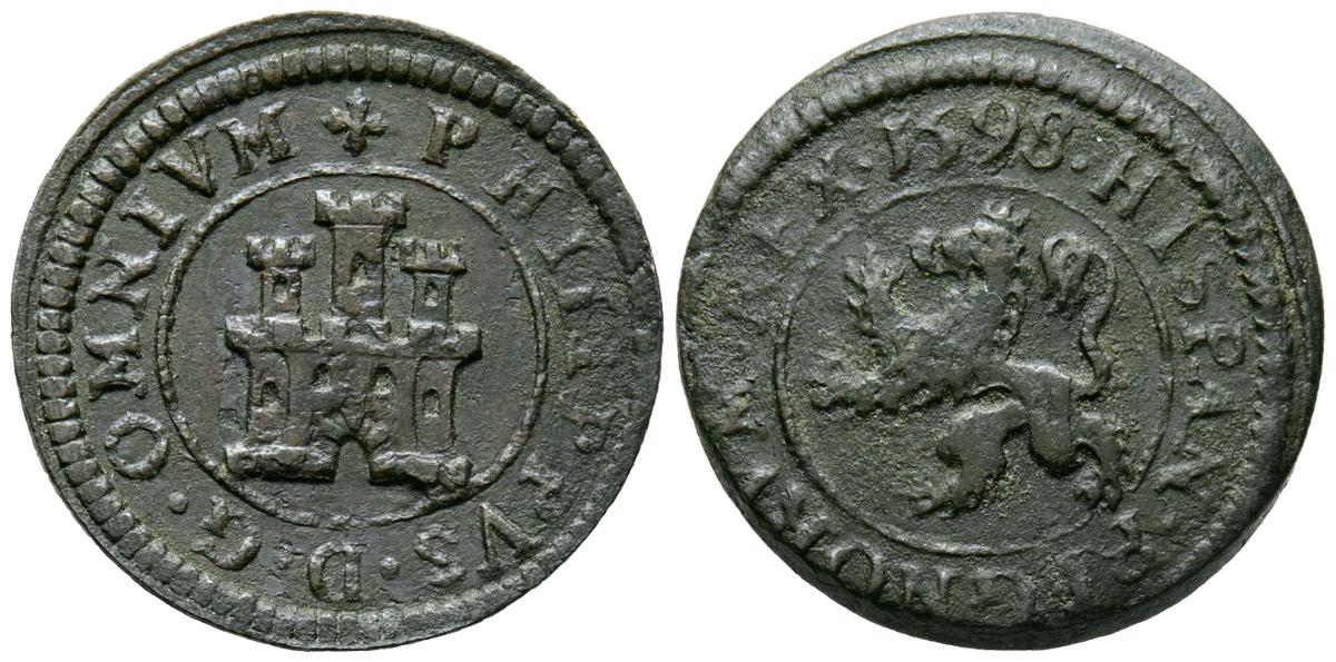 FELIPE II (1556-1598). 2 Maravedís. (Ve. 3,42g/20mm). 1598. Segovia. (Cal-2019-87). Sin indicador de ceca ni valor. MBC+. Escaso ejemplar.