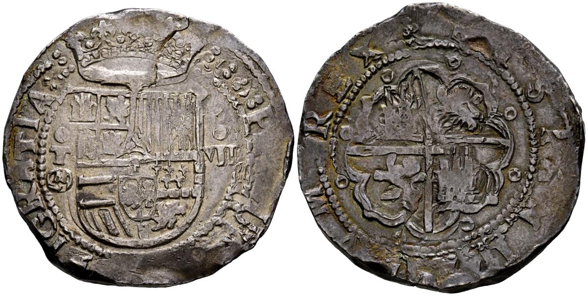 FELIPE II (1556-1598). 8 Reales. (Ar. 27,43g/41mm). S/D (desde 1578) Toledo M. (Cal-2019-749). Error en valor: VII. MBC+. Bonito ejemplar.