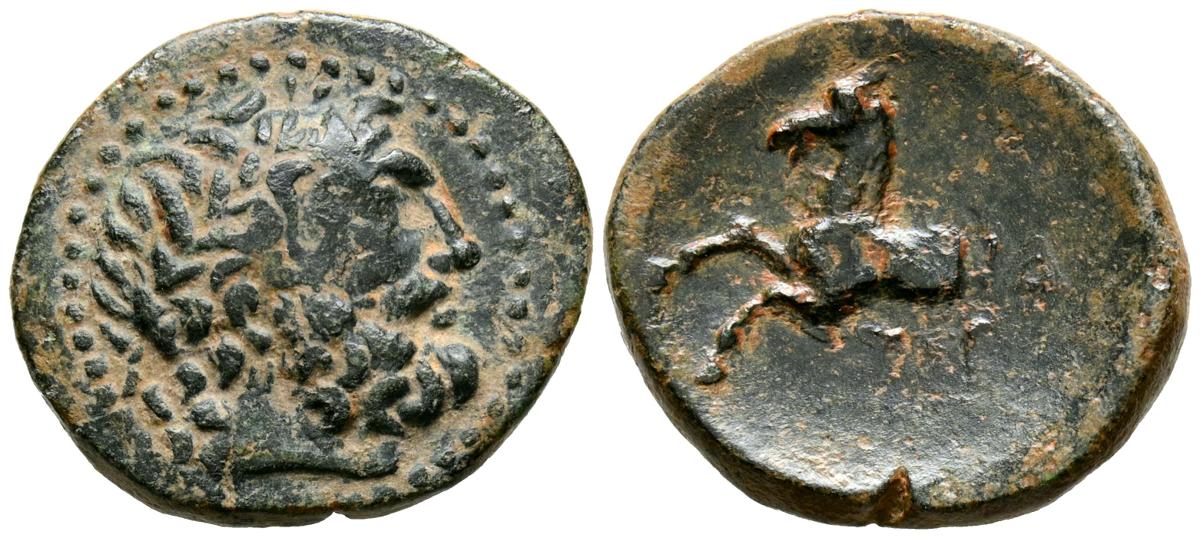 PISIDIA, Termessos. Ae20. (Ae. 5,31g/22mm). Siglo I a.C. (SNG von Aulock 5331). Anv: Cabeza de Zeus a derecha. Rev: Caballo a izquierda, encima H, debajo TEP. MBC.