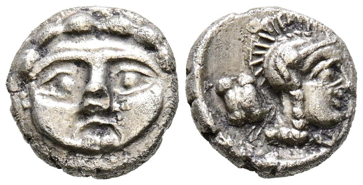PISIDIA, Selge. Obolo. (Ar. 0,96g/10mm). 350-300 a.C. (SNG BN 1933). Anv: Cabeza de frente de Gorgona. Rev: Cabeza con casco de Atenena a derecha, detrás punta de lanza. MBC+.