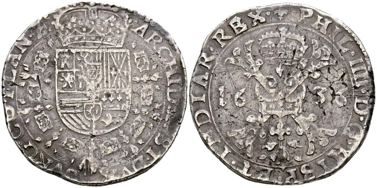 FELIPE IV (1621-1665).Patagón (Ar. 27,71g/41mm). 1636. Brujas. (Vicenti-1064). BC+/MBC-. Escasa.