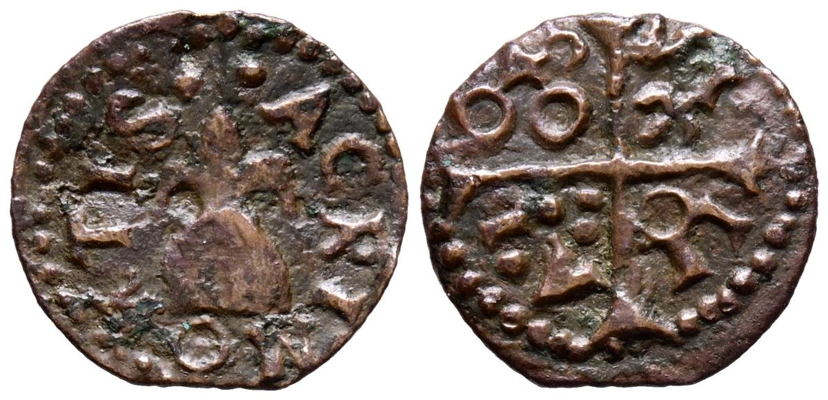GUERRA DELS SEGADORS (1640-1652). Diner. (Ae. 0,54g/13mm). 1643. Agramunt. (Cal-2019-5). Flor de lis en 2º cuadrante del reverso. MBC.