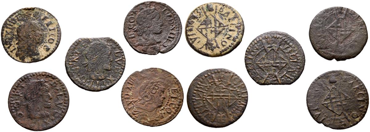 Interesante conjunto de 5 monedas de cobre de la Guerra dels Segadors acuñados en Barcelona. A EXAMINAR.