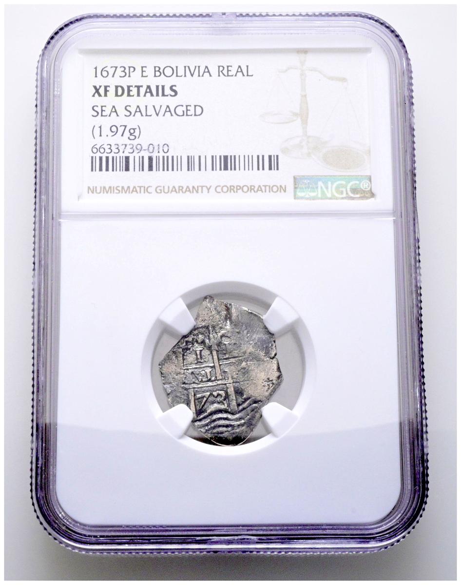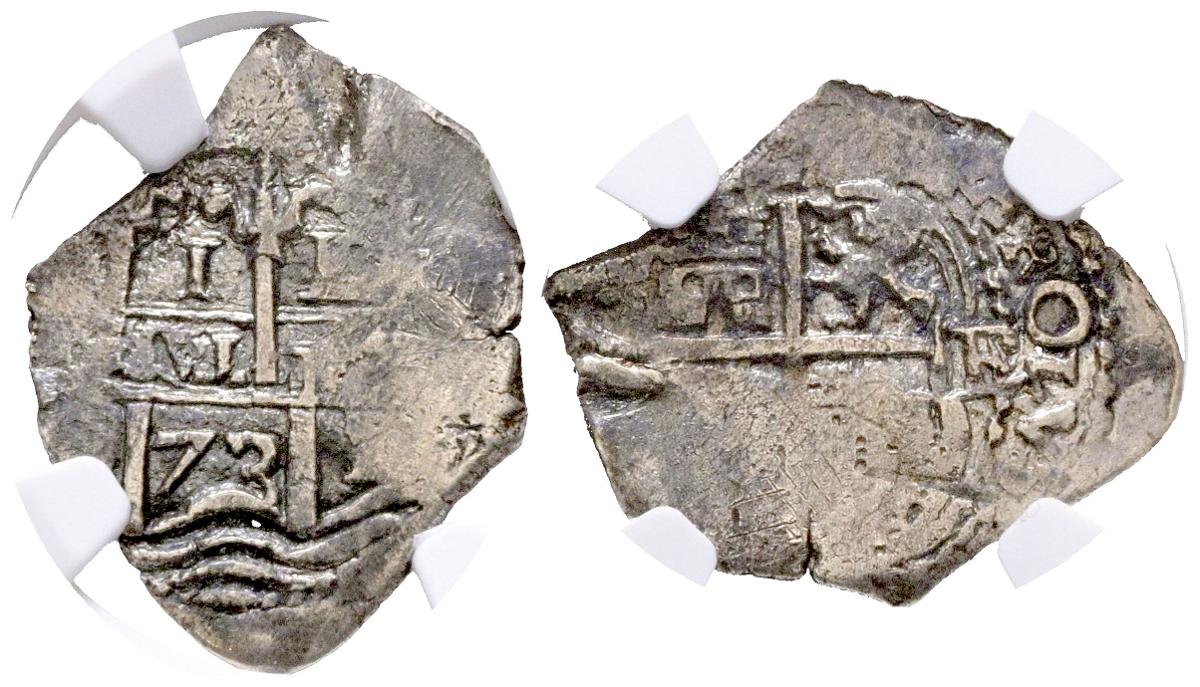 CARLOS II (1665-1700). 1 Real (Ar. 1,97g/20mm). 1673. Potosí E. (Cal-2019-258). Encapsulado por NGC. XF Details. Oxidaciones.