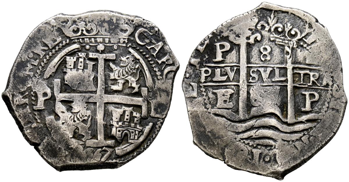 CARLOS II (1665-1700). 8 Reales (Ar. 27,14g/39mm). 1667. Potosí E. (Cal-2019-698). MBC+. Alguna oxidación. Pieza muy completa. Dos fechas parcialmente visibles.
