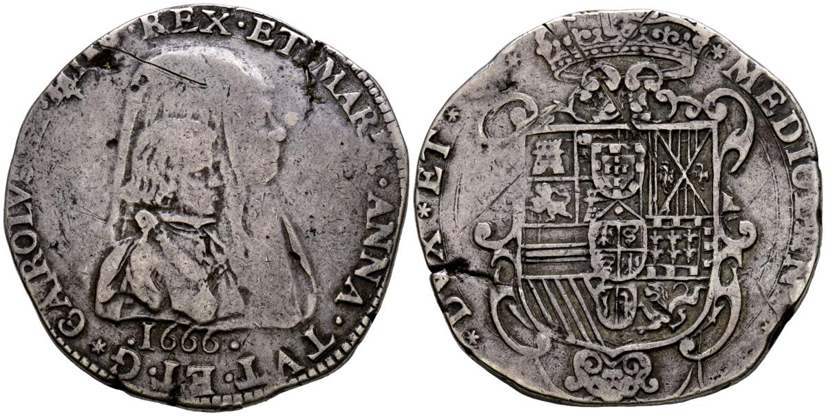 CARLOS II (1665-1700). 1 Felipe. (Ar. 27,44g/41mm). 1666. Milán. (Vicenti 18). MBC. Escaso.