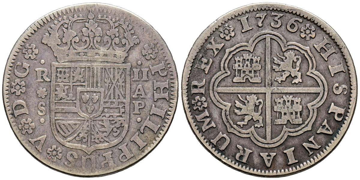 FELIPE V (1700-1749). 2 Reales. (Ar. 5,57g/26mm). 1736. Sevilla PA. (Cal-2019-993). MBC-.