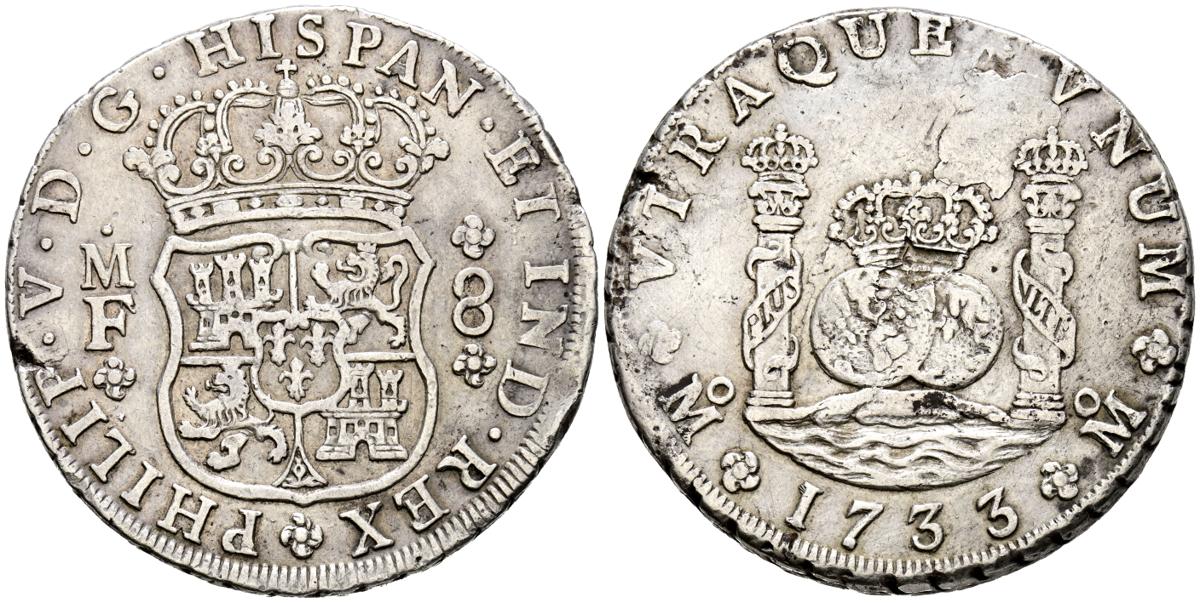 FELIPE V (1700-1746). 8 Reales. (Ar. 26,58g/38mm). 1733. Mexico MF. (Cal-2019-1439). Corona normal. MBC. Muy raro ejemplar.“Las piezas columnarias de Méjico de 1732 y 1733 siempre han ejercido una gran atracción para los coleccionistas del Nuevo y del Viejo Mundo. Por un lado, son las primeras monedas de cordoncillo producidas en América, y por tanto, son un antecedente muy directo de la emisión de Dólares de plata por parte de los Estados Unidos y de 8 Reales y Pesos producidos con la misma métrica por los países hispanoamericanos después de la Emancipación. Y por otro lado, los ejemplares producidos en estos años, necesariamente tuvieron que ser acuñados en un número muy reducido (…). Además, parece evidente que estas monedas de 1732 y 1733 tenían un carácter de cuasi pruebas, ya que su objeto no era el de producir circulante (lo que se seguía llevando a cabo con la emisión de monedas macuquinas en estos dos años), sino verificar el funcionamiento de la maquinaria importada desde España y comprobar la forma definitiva en que ésta debía quedar instalada en la nueva Casa de Moneda”. Ernesto G. Guinea.