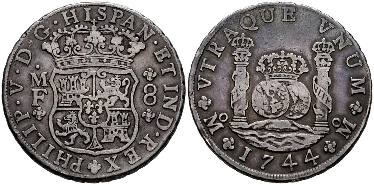 FELIPE V (1700-1746). 8 Reales. (Ar. 26,72g/39mm). 1744. Mexico MF. (Cal-2019-1466). MBC.