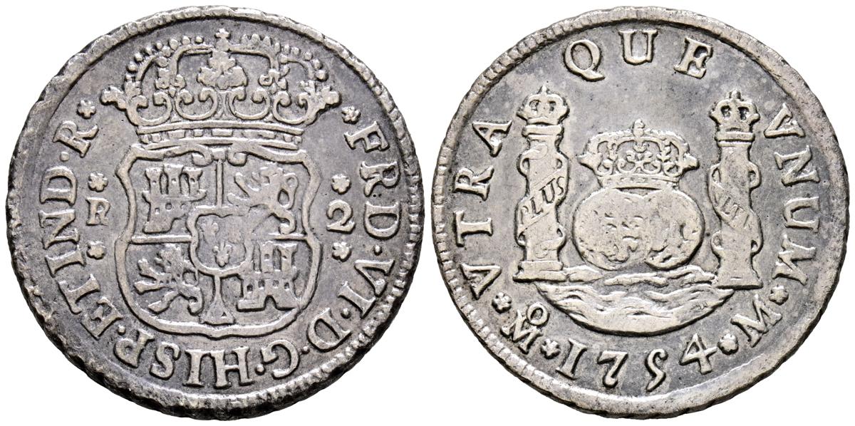 FERNANDO VI (1746-1759). 2 Reales (Ar. 6,42g/26mm). 1754. México M. (Cal-2019-295). MBC+. Restos de brillo original.