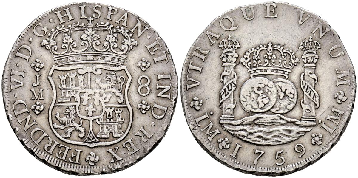 FERNANDO VI (1746-1759). 8 Reales. (Ar. 27,05g/39mm). 1759. Lima JM. (Cal-2019-467). MBC. Estuvo engarzada. Cospel algo irregular.