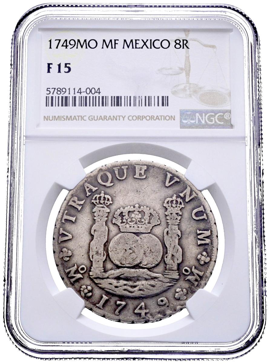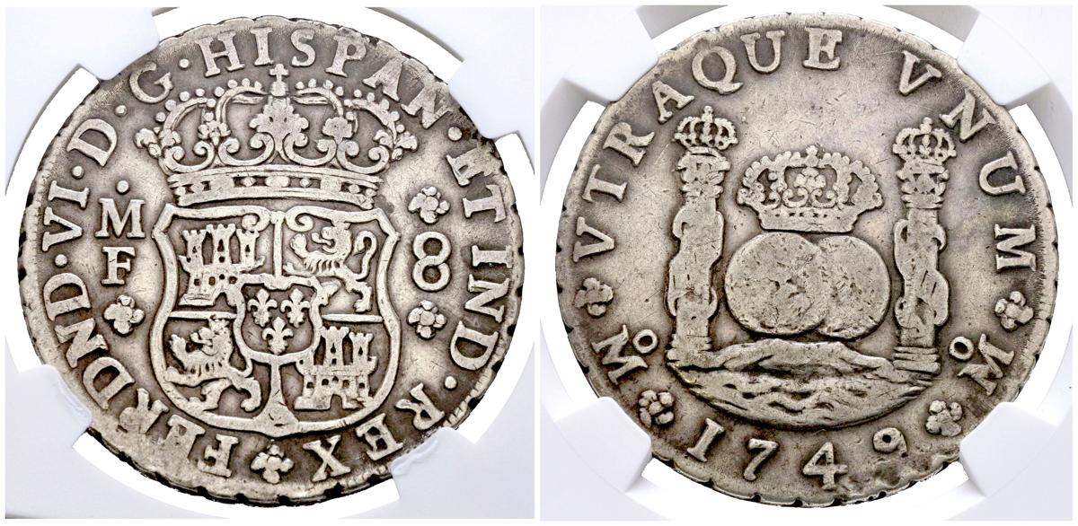 FERNANDO VI ( 1746-1759). 8 Reales. (Ar. 27,00g/38mm)*. 1749. México MF. (Cal-2019-473). Encapsulada por NGC F 15. Peso y medidas teóricos.