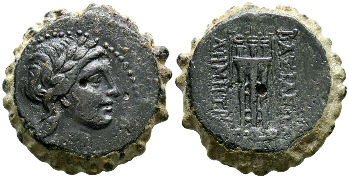 REINO SELEUCIDA, Demetrios I Soter. Ae16. (Ae. 15,98g/26mm). 162-150 a.C. (HGC 9, 821; Seaby 1644). Anv: Cabeza laureada de Apolo a derecha. Rev: Trípode entre dos leyenda griegas. MBC.
