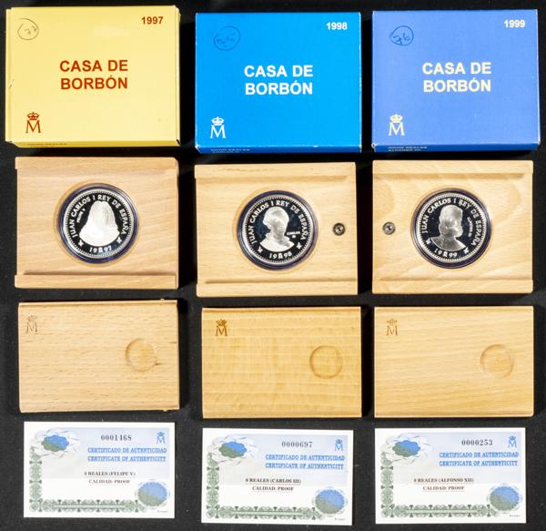 JUAN CARLOS I (1975-2014). Conjunto de 3 estuches oficiales y completos de la serie Casa de Borbón de 2000 Pesetas. 1997 (Felipe V), 1998 (Carlos III) y 1999 (Alfonso XII). FNMT. PROOF.