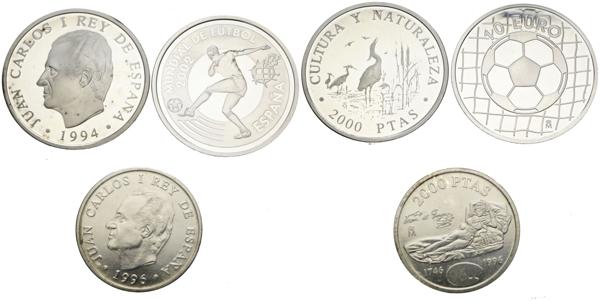 JUAN CARLOS I (1975-2014). Conjunto de 3 monedas en plata con valores de 2000 Pesetas (incluye una pieza de la serie Cultura y Naturaleza y 10 Euros (Mundial de fútbol de 2002). Piezas en PROOF y SC.