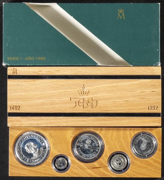 JUAN CARLOS I (1975-2014). Estuche completo compuesto por 5 monedas en plata de valores comprendidos entre 2000 y 100 Pesetas. Quinto Centenario. 1989. Serie I. FNMT. FDC Mate. Incluye estuche original.