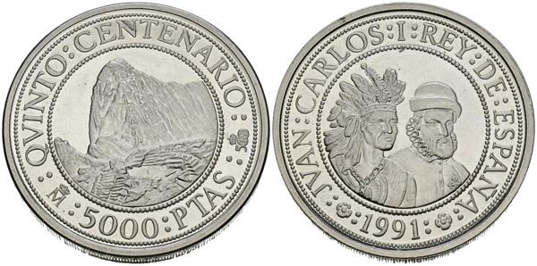 JUAN CARLOS I (1975-2014). 5000 Pesetas. (Ar. 53,67g/40mm). Serie Quinto Centenario. Serie III. 1991. FNMT. Pizarro y Atahualpa EBC+