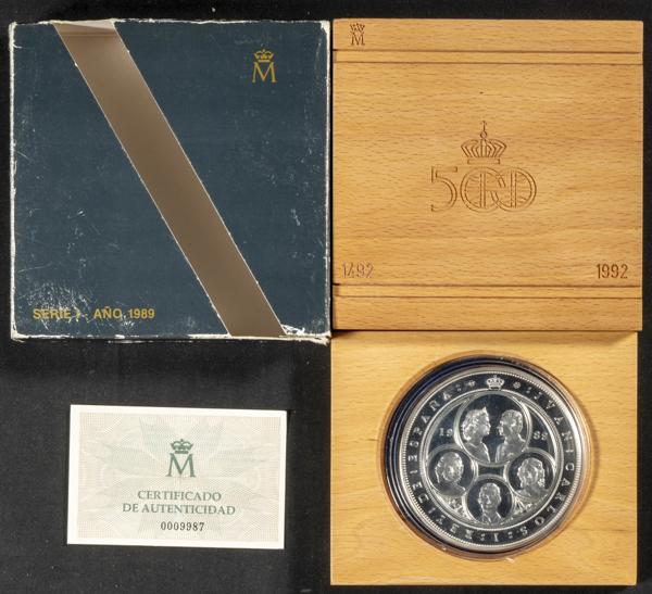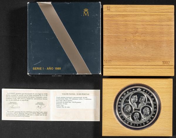 JUAN CARLOS I (1975-2014). 10.000 Pesetas. (Ar. 168,75g /73mm). V Centenario. 1989. Serie I. FNMT. FDC. Presentado en estuche oficial (mal estado de conservación) y con certificado de autenticidad. 60 mil unidades emitidas.