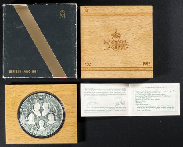 JUAN CARLOS I (1975-2014). 10.000 Pesetas. (Ar. 168,75g/73mm). V Centenario. Descubridores y Conquistadores 1991. Serie III. FNMT. FDC. Presentada en estuche oficial con certificado. Tirada de 35 mil unidades.