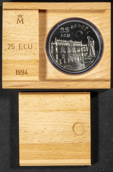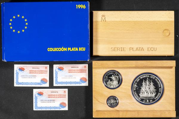 JUAN CARLOS I (1975-2014). Colección Plata Ecu. Valores de 1 (Timón), 5 (Coca de Mataró) y 25 (Villa de Madrid) ECU. 1996. FNMT. FDC. Incluye estuche original y certificados de autenticidad.