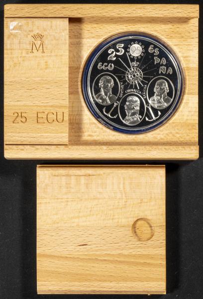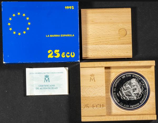 JUAN CARLOS I. 25 Ecu. (Ar. 168,75g/73mm). Serie de la Marina Española. Churruca, Gravina y Alcalá Galiano. 1995. FNMT. FDC. Presentada en estuche oficial y con certificado de autenticidad.