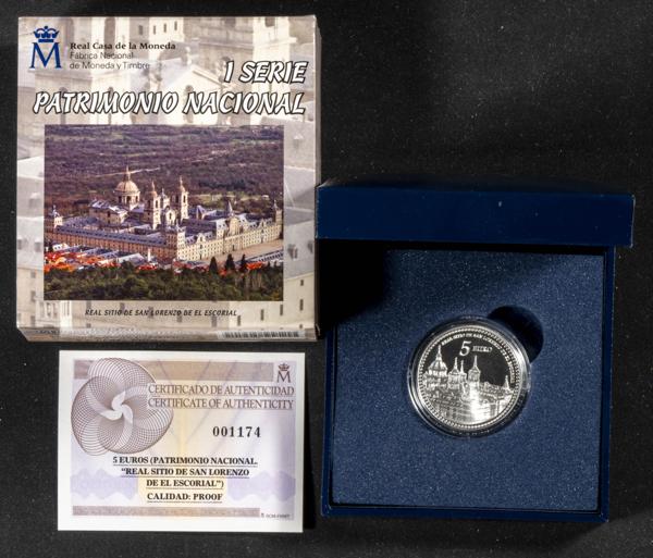JUAN CARLOS I (1975-2014). 5 Euros. (Ar. 13,50g /33mm). I Serie. Patrimonio Nacional. Real Sitio de San Lorenzo del Escorial. 2013. FNMT. PROOF. Presentado en estuche oficial y con certificado de autenticidad. 7 mil unidades emitidas.