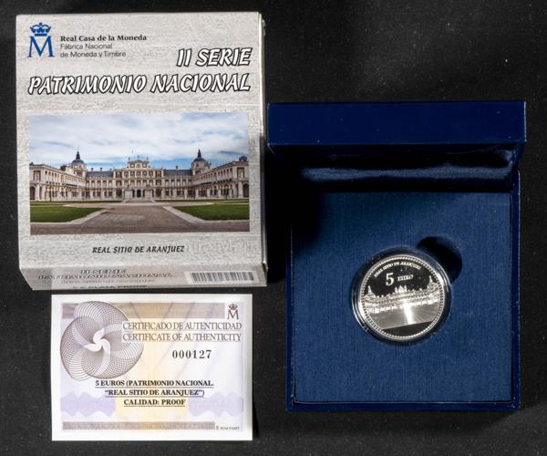 JUAN CARLOS I (1975-2014). 5 Euros. (Ar. 13,50g /33mm). II Serie. Patrimonio Nacional. Real Sitio de Aranjuez. 2014. FNMT. PROOF. Presentado en estuche oficial y con certificado de autenticidad. 7 mil unidades emitidas.