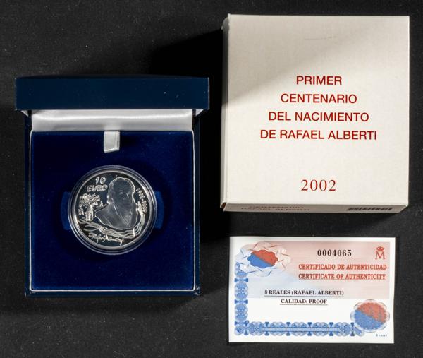 JUAN CARLOS I (1975-2014). 10 Euros (Ar. 27,00g/40mm). I Centenario del Nacimiento de Rafael Alberti. 2002. FNMT PROOF. Incluye estuche original y certificado de autenticidad. Tirada de 25.000 unidades.