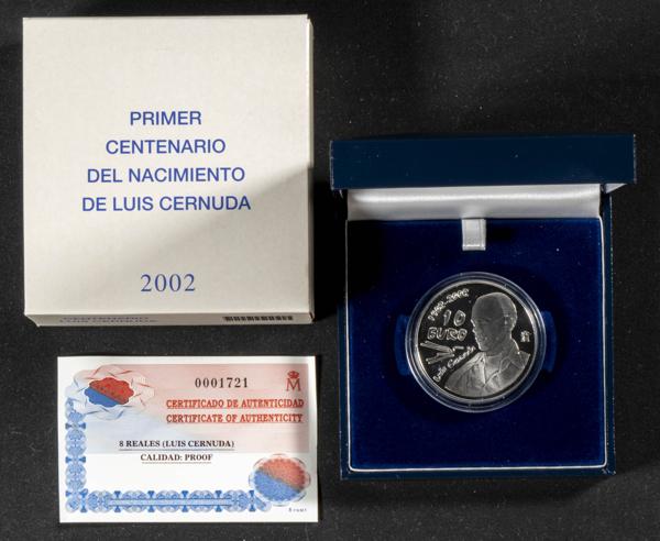 JUAN CARLOS I (1975-2014). 10 Euros (Ar. 27,00g/40mm). Primer Centenario del Nacimiento de Luis Cernuda. 2002. FNMT. PROOF. Incluye estuche original y certificado de autenticidad. Tirada de 25.000 unidades.
