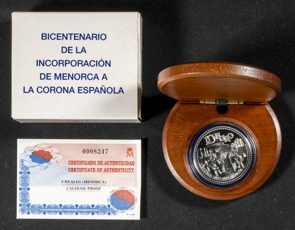JUAN CARLOS I (1975-2014). 10 Euros (Ar. 27,00g/40mm). Bicentenario de la incorporación de Menorca a la Corona. 2002. FNMT. PROOF. Incluye estuche original y certificado de autenticidad. Tirada de 30.000 unidades.