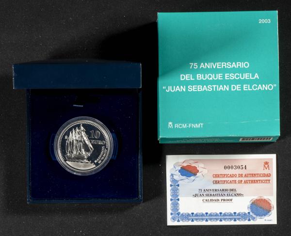 JUAN CARLOS I (1975-2014). 10 Euros (Ar. 27,00g/40mm). 75 Aniversario del Buque Escuela Juan S. Elcano. 2003. FNMT PROOF. Incluye estuche original y certificado de autenticidad. Tirada de 50.000 unidades.