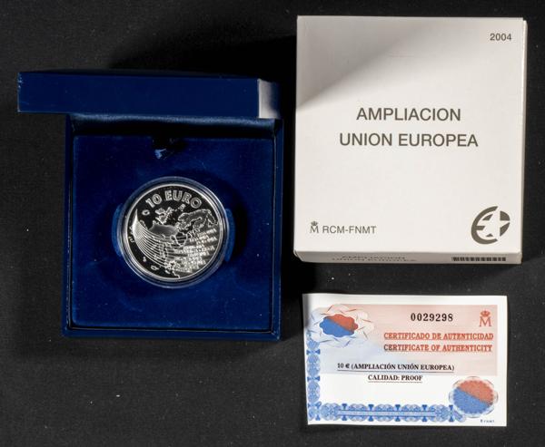JUAN CARLOS I (1975-2014). 10 Euros (Ar. 27,00g/40mm). Ampliación de la Unión Europea. 2004. FNMT PROOF. Incluye estuche original y certificado de autenticidad. Tirada de 50.000 unidades.